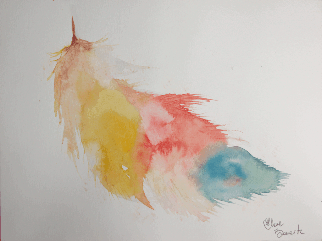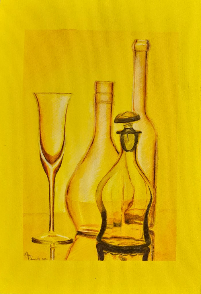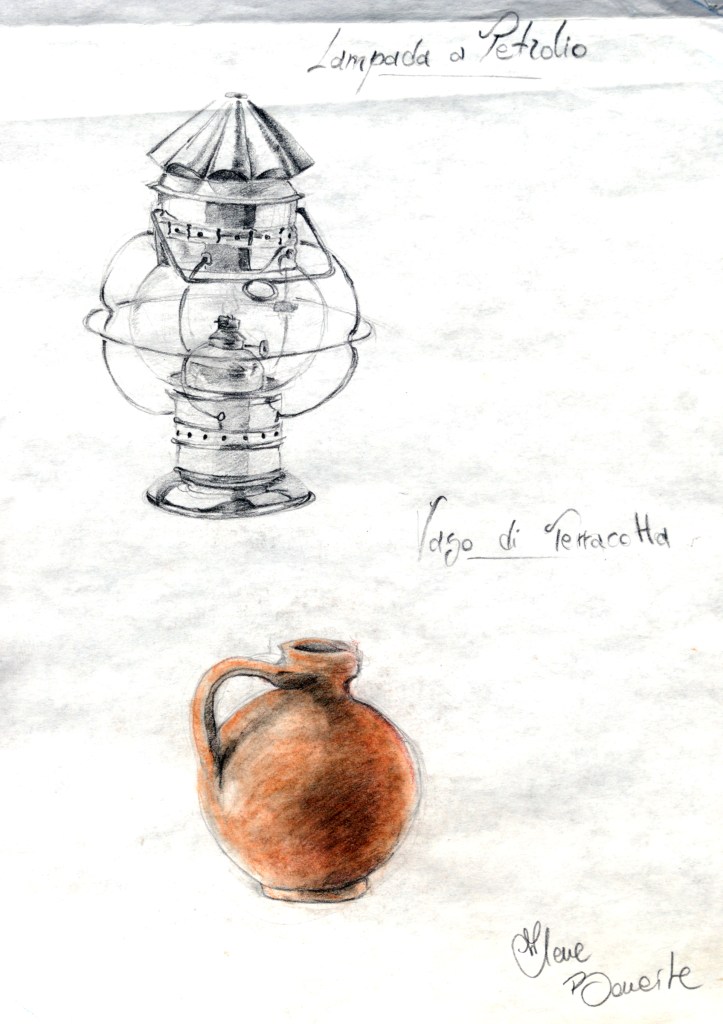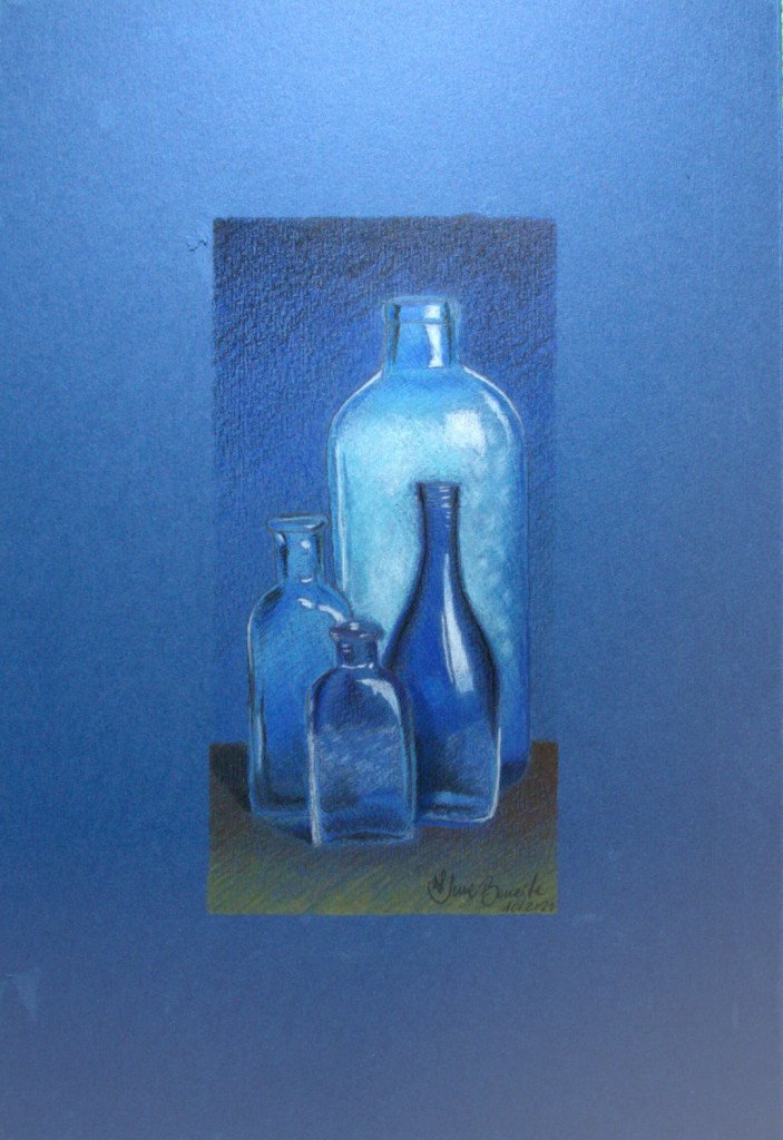 OGGETTI Bottiglie vetro giallo, matite acquerellabili 24×16,5 Bottiglie vetro blu, matite acquerellabili 24×16,5 Piuma, acquerello 21×28 Vaso blu, acquerello 26×18 Lettera E, matite colorate Lampada e vaso, grafite e gessetti colorati